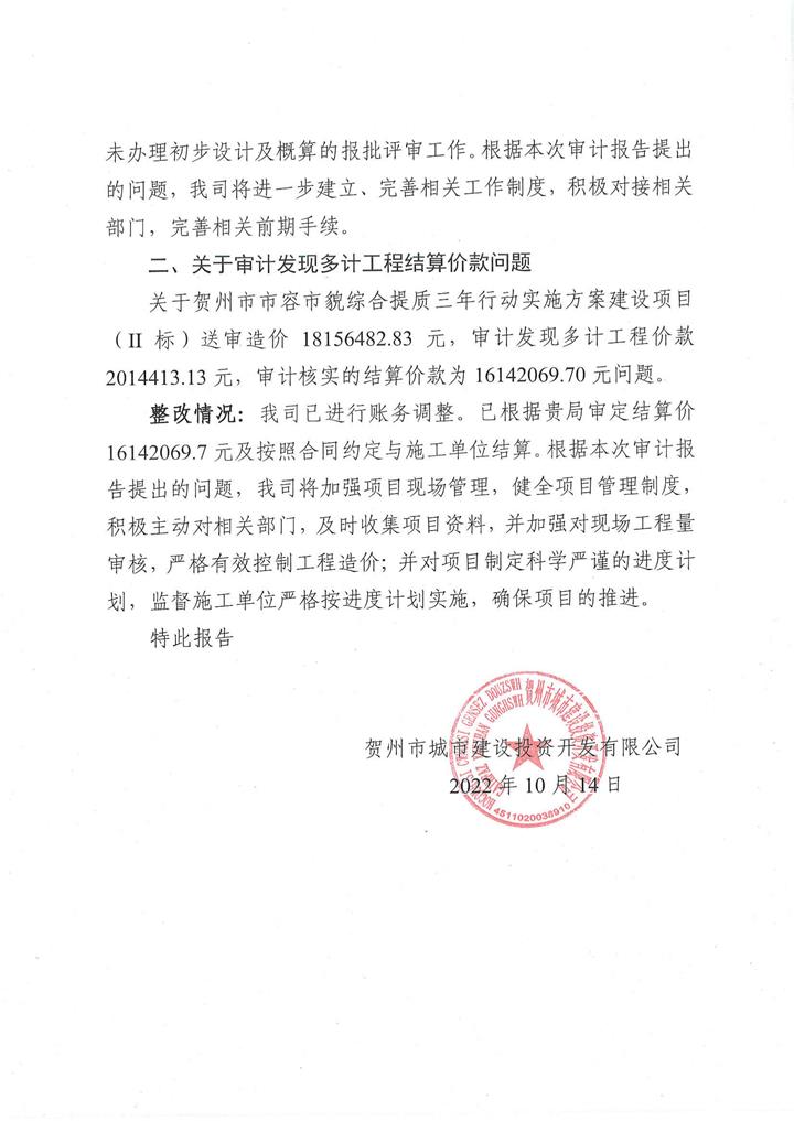 城投公司關于市容市貌綜合提質三年行動實施方案建設項目(2)標審計問題整改情況報告