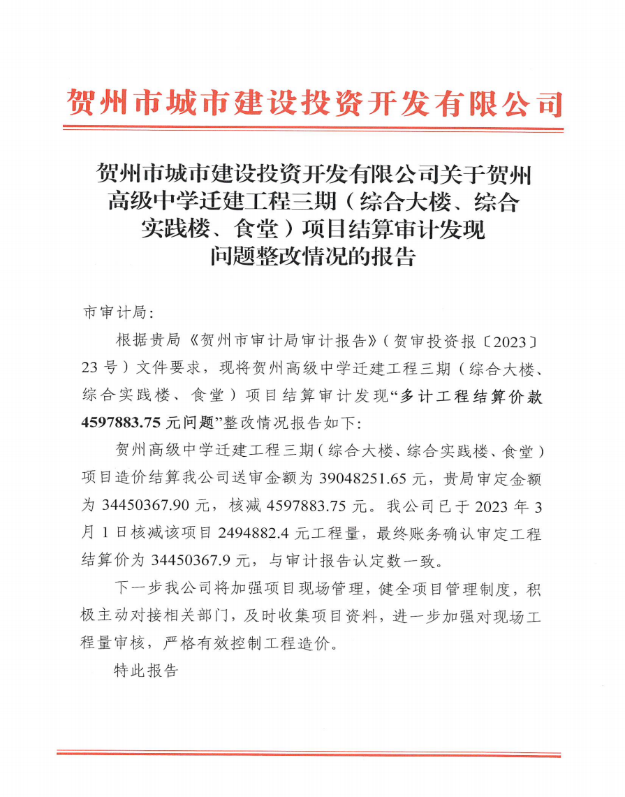 關于賀州高級中學遷建工程三期項目結算審計發現問題整改情況的報告
