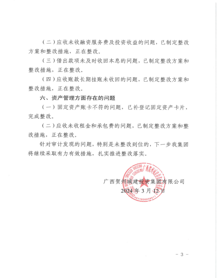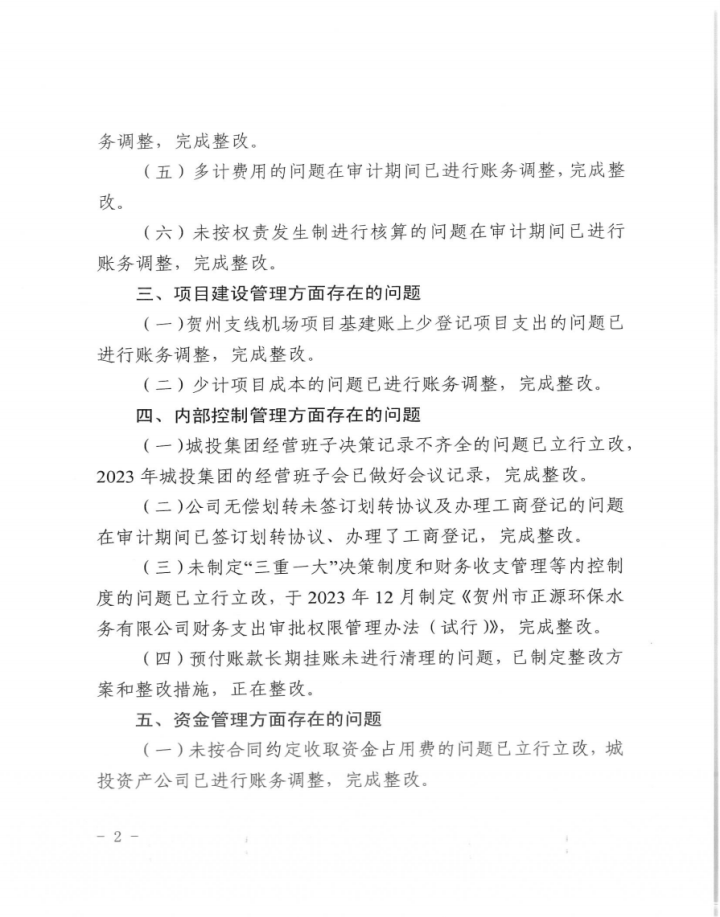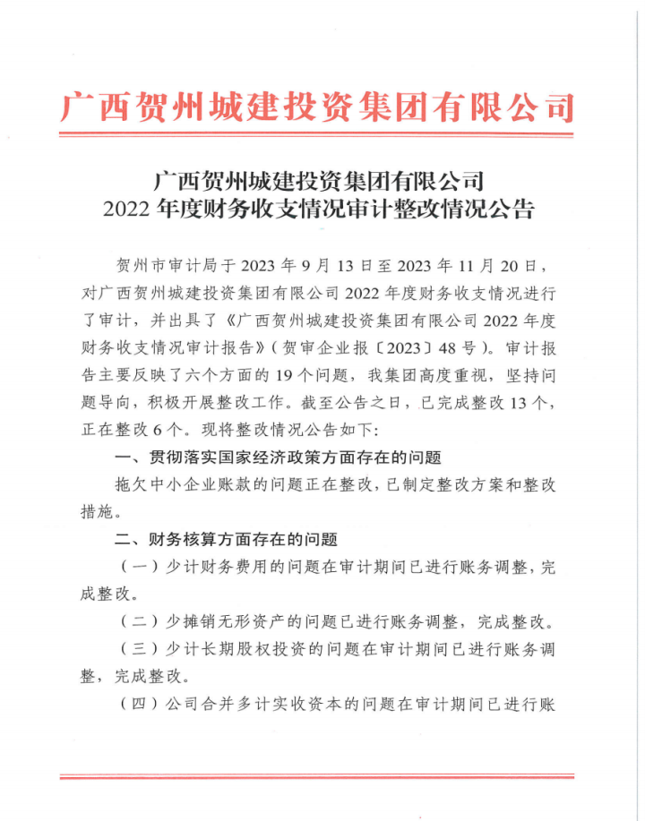 廣西賀州城建投資集團有限公司2022年度財務收支情況審計整改情況公告